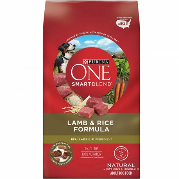 Description_x000D_ _x000D_ 8.00 lb. Delight your dog with Purina ONE SmartBlend Natural Lamb & Rice Formula adult dry dog food, giving him the complete and balanced nutrition he needs in a highly digestible formula._x000D_ Ingredients_x000D_ Lamb (Source Of Glucosamine), Rice Flour, Whole Grain Corn, Whole Grain Wheat, Chicken By-Product Meal (Source Of Glucosamine), Corn Gluten Meal, Soybean Meal, Beef Fat Naturally Preserved With Mixed-Tocopherols, Mono And Dicalcium Phosphate, Glycerin, Calcium Carbonate, Liver Flavor, Salt, Caramel Color, Soybean Oil, Potassium Chloride, Dried Carrots, Dried Peas, Vitamins [Vitamin E Supplement, Niacin (Vitamin B-3), Vitamin A Supplement, Calcium Pantothenate (Vitamin B-5), Thiamine Mononitrate (Vitamin B-1), Vitamin B-12 Supplement, Riboflavin Supplement (Vitamin B-2), Pyridoxine Hydrochloride (Vitamin B-6), Folic Acid (Vitamin B-9), Menadione Sodium Bisulfite Complex (Vitamin K), Vitamin D-3 Supplement, Biotin (Vitamin B-7)], Minerals [Zinc Sulfate, Ferrous Sulfate, Manganese Sulfate, Copper Sulfate, Calcium Iodate, Sodium Selenite], Choline Chloride, L-Lysine Monohydrochloride, Sulfur. V-4162.